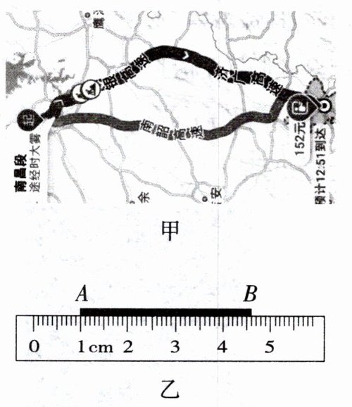 14. 如图甲所示是某地图软件上的南昌到瑞金的一段公路线,小明用细线沿此图上公路线截取相同一段,拉直后的长如图乙中线段AB所示。
