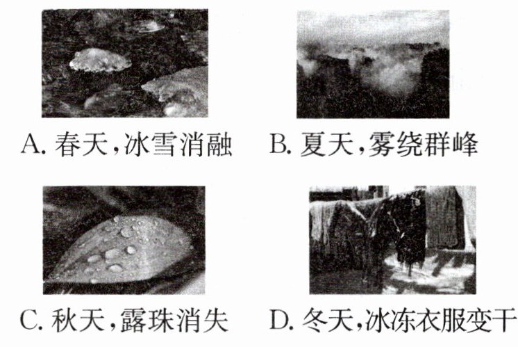 5. 情境应用 小飞吃雪糕时发现冰箱里雪糕的外包装上有许多白色的“粉”,去掉外包装后雪糕周围冒出了“烟”;将雪糕放进空茶杯里,过了一会儿茶杯外壁出“汗”了,杯子里雪糕“化”了。关于上述现象,下列说法正确的是( )