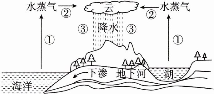 10. 如图所示是水循环示意图,水循环是指地球上各种形态的水,在太阳辐射、地球引力等作用下,不断进行周而复始的运动过程。