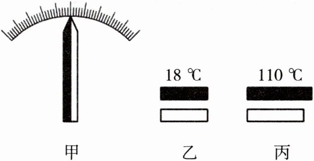 9. 科技应用 小明将形状相同的铝片和铜片铆在一起制作了如图甲所示的双金属片温度计(温度升高或降低时,双金属片会发生弯曲,从而带动指针左右偏转)。分析乙、丙两图可知,在相同条件下,______(选填“黑”或“白”)色金属片的受热膨胀更显著。若图甲中央刻度线为$0^{\circ}C$,在气温为$-100^{\circ}C$时,指针应在中央刻度线的________(选填“左侧”或“右侧”)。