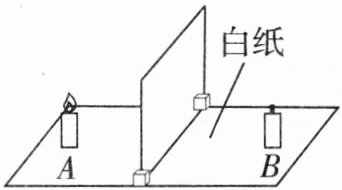 (4) 如图,在玻璃板前面点燃蜡烛A,将另一支不点燃的蜡烛B竖立在玻璃板后面移动,人眼一直在玻璃板______(选填“A”或“B”)侧观察,直至蜡烛B和蜡烛A的像完全重合。