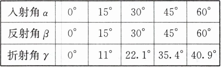 7. 某同学在做研究光的折射现象的实验,如图所示是一束激光从空气射入水中时的光路。实验中发现折射光线、入射光线和法线在同一平面内,折射光线和入射光线分别位于法线的两侧,通过多次实验还得到如下表所示的数据: