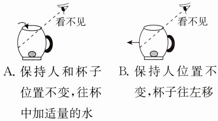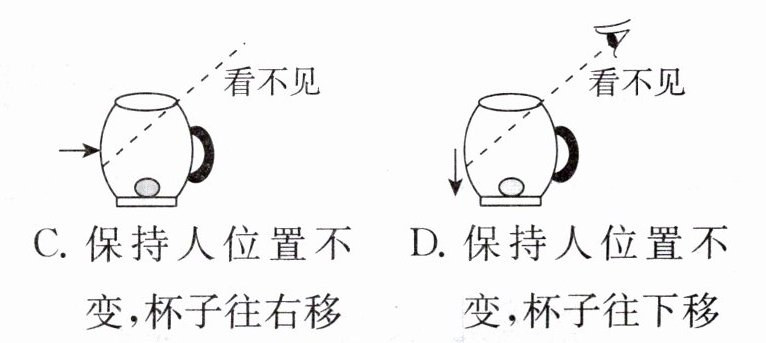 10. 在陶瓷杯底放一枚硬币,人移动到某一位置时看不见硬币了。为了能再次看到杯底的硬币,下列做法不能实现的是( )