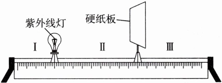 步骤一:如图所示,固定好紫外线灯和涂有荧光物质的硬纸板,将一块大小合适的玻璃板放置在______(选填“Ⅰ”“Ⅱ”或“Ⅲ”)区域,且调整玻璃板与硬纸板平行。