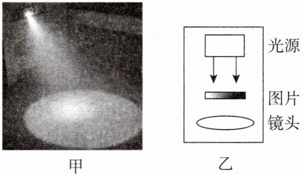 9. 模型构建 如图甲所示为某公园内装在高处的宣传投影灯,其内部结构如图乙所示,它主要由光源、画有图案的透明图片和凸透镜组成,夜晚投影灯照在地面上出现清晰的图案。下列说法正确的是( )