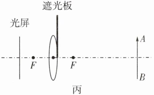 (6)小明利用手机拍摄学校体育馆时发现像不完整,他分析可能是在拍摄时,手指遮挡了部分摄像头所致。为了进一步分析此原因,他利用凸透镜、光屏、发光体AB和一张足够大的遮光板进行探究。将发光体AB、凸透镜和光屏依次组装到光具座上,调整它们的位置,使光屏上恰能观察到AB清晰的像。接着,将遮光板紧贴着凸透镜自上而下插入镜头前,直至挡住其上半部分(如图丙所示),在该过程中,AB在光屏上所成像的大小____(选填“变大”“变小”或“不变”),亮度____(选填“变亮”“变暗”或“不变”)。