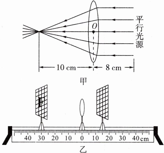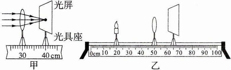 (2)图甲平行光射向凸透镜,光屏上有个最小、最亮的光斑。此凸透镜的焦距为____cm。