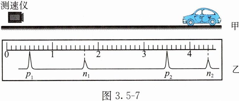 [解析]设超声波信号p₁发出后,汽车在M点接收到信号并将信号反射回去,如答图3.5 - 2所示,测速仪接收到的超声波信号是n₁,从题图乙中可以看出,p₁、n₁之间有12个小格,可得$\Delta t₁ = \frac{1.0 s}{30} × 12 = 0.4 s$,超声波匀速传播,因此测速仪与M点之间的距离为$s₁ = \frac{v \Delta t₁}{2} = \frac{340 × 0.4}{2} m = 68 m$。