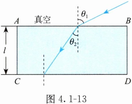 8. 如图 4.1 - 13 所示,上、下表面平行的玻璃砖的厚度为 $ l $,玻璃砖的折射率 $ n = \sqrt{3} $,光从上表面 $ AB $ 射入的入射角 $ \theta_1 = 60° $,光在真空中的传播速度为 $ c $。求: