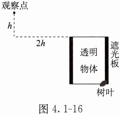 11. 物理社团的同学想测量一透明物体的折射率。如图 4.1 - 16 所示,透明物体左右两侧紧靠遮光板,右下方压着一片小树叶,观察点距离透明物体左上边缘的高度为 $ h $、水平距离为 $ 2h $ 时,恰好看到树叶。移走透明物体(小树叶和遮光板的位置不动),观察点水平向右移动,当水平移动距离 $ \frac{3}{2}h $ 时,恰好又看到小树叶。则透明物体的折射率为( )。