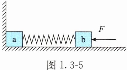 1. 木块 a 和 b 用一根轻弹簧连接起来,放在光滑水平面上,a 紧靠在墙壁上,在 b 上施加向左的水平力 $ F $ 使弹簧压缩,如图 1.3 - 5 所示,在撤去水平力 $ F $ 后,下列说法正确的是( )。