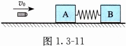 9. 如图 1.3 - 11 所示,两个质量都为 $ m $ 的木块 A、B 用轻质弹簧相连放在光滑的水平面上,一颗质量为 $ m_0 $ 的子弹以速度 $ v_0 $ 射向木块 A 并嵌在其中。已知子弹与木块的作用时间极短,求弹簧被压缩后的最大弹性势能。