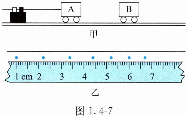 4. 如图 1.4 - 7 甲所示,在水平光滑轨道上停着 $ A $、$ B $ 两辆实验小车,$ A $ 车上系有一穿过打点计时器的纸带,当 $ A $ 车获得水平向右的速度时,随即启动打点计时器。$ A $ 车运动一段距离后,与静止的 $ B $ 车发生正碰并粘在一起运动,纸带记录下碰撞前 $ A $ 车和碰撞后两车的运动情况,如图 1.4 - 7 乙所示,电源频率为 $ 50Hz $。则碰撞前 $ A $ 车的速度大小为______ $ m/s $,碰撞后两车的共同速度大小为______ $ m/s $。