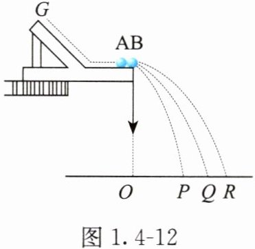 1. 某同学用如图 1.4 - 12 所示装置通过半径相同的 $ A $、$ B $ 两球的碰撞来验证动量守恒定律。实验时先使 $ A $ 球从斜槽上某一固定位置 $ G $ 由静止开始滚下,落到位于水平地面的记录纸上,留下痕迹。重复上述操作 10 次,得到 10 个落点痕迹。再把 $ B $ 球放在水平槽上靠近槽末端的地方,让 $ A $ 球仍从位置 $ G $ 由静止开始滚下,和 $ B $ 球碰撞后,$ A $、$ B $ 两球分别在记录纸上留下各自的落点痕迹。重复这一操作 10 次,得到了如图 1.4 - 13 所示的 3 个落点。