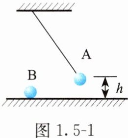 如图1.5-1所示,A、B两球质量相同(大小不计),A球用细绳吊起,细绳长度等于悬点距地面的高度,B球静止放于悬点正下方的地面上。现将A球拉到距地面高度为$ h $处由静止释放,A球摆动到最低点与B球碰撞后粘在一起共同上摆,则它们升起的最大高度为( )。