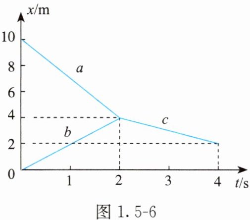 5. (多选)A、B两球沿直线运动并发生正碰,图1.5-6为两球碰撞前后的$ x - t $图像,$ a $、$ b $分别为A、B两球碰前的运动图线,$ c $为碰撞后两球共同的运动图线。若A球的质量$ m = 2kg $,则下列结论正确的是( )。