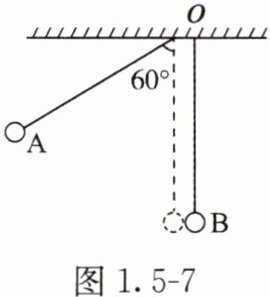 6. 如图1.5-7所示,两个大小相同的小球A、B用等长的细线并排悬挂,线长为$ l $,$ m_A = 2m_B $,若将A由图示位置静止释放,在最低点与B相碰,小球大小可忽略不计,重力加速度为$ g $,则下列说法正确的是( )。