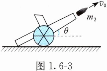 5. 如图 1.6 - 3 所示,装有炮弹的火炮总质量为 $m_1$,炮弹的质量为 $m_2$,炮弹射出炮口时对地的速率为 $v_0$。若炮管与水平地面的夹角为 $\theta$,则火炮后退的速度大小为(设水平地面光滑)( )。