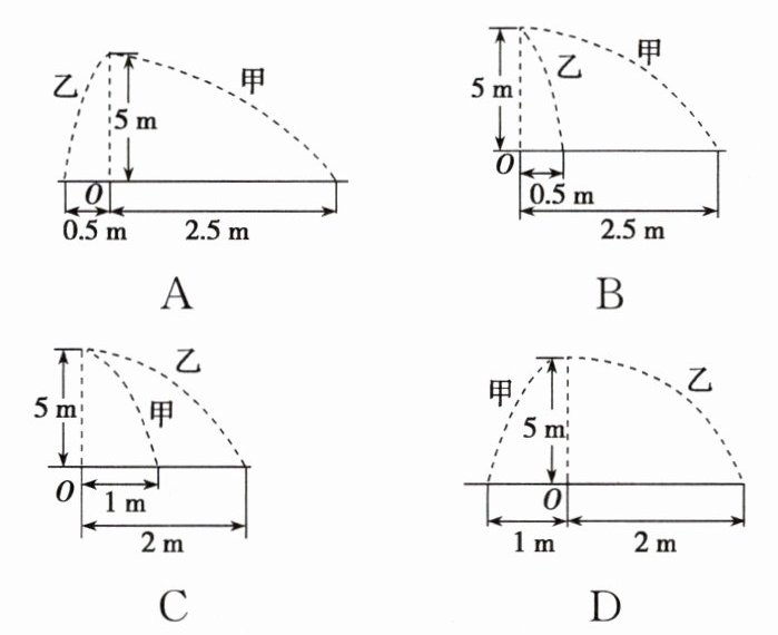 3. 一弹丸在飞行到距离地面 $5\ m$ 高时仅有水平速度 $v = 2\ m/s$,爆炸成为甲、乙两块弹片水平飞出,甲、乙的质量之比为 $3:1$。不计质量损失,重力加速度 $g$ 取 $10\ m/s^2$,则甲、乙两块弹片飞行的轨迹可能正确的是( )。