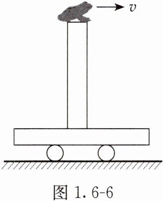 8. 如图 1.6 - 6 所示,一质量为 $m_0$ 的玩具蛙蹲在质量为 $m$ 的小车的细杆上,小车静止在光滑的水平面上。若车长为 $l$,细杆高为 $h$ 且位于小车的中央,试问玩具蛙对地最小以多大的水平速度跳出才能落到地面上?(重力加速度为 $g$,车面高度忽略不计)