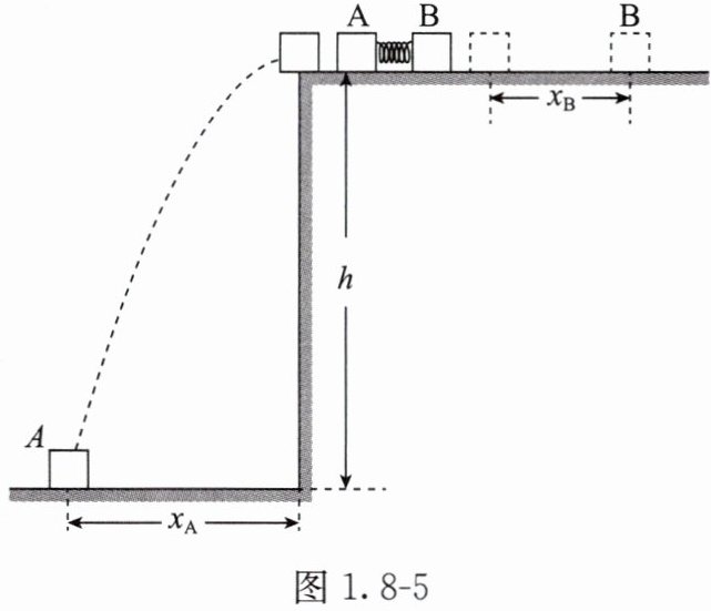 6. (2024·黑吉辽)如图1.8-5所示,高度h = 0.8m的水平桌面上放置两个相同物块A、B,质量m_A = m_B = 0.1kg。A、B间夹一压缩量Δx = 0.1m的轻弹簧,弹簧与A、B不拴接。同时由静止释放A、B,弹簧恢复原长时A恰好从桌面左端沿水平方向飞出,水平射程x_A = 0.4m;B脱离弹簧后沿桌面滑行一段距离x_B = 0.25m后停止。A、B均视为质点,取重力加速度g为10m/s²。求: