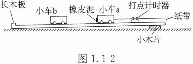 3. 某同学设计了一个用打点计时器验证碰撞过程中系统动量守恒的实验:在小车a的前端粘有橡皮泥,推动小车a使之做匀速直线运动。然后与原来静止在前方的小车b相碰并粘合成一体,而后两车继续做匀速直线运动,他设计的具体装置如图1.1-2所示。在小车a后连着纸带,打点计时器的打点频率为50Hz,长木板下垫着小木片用以平衡摩擦力。