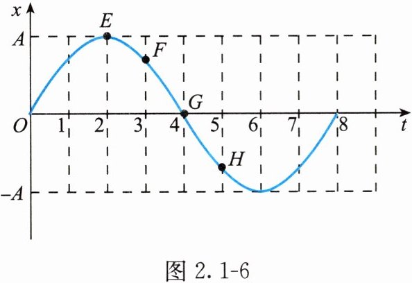 例题 2 一个质点以 $ O $ 点为中心做简谐运动,位移随时间变化的 $ x - t $ 图像如图 2.1 - 6 所示,$ E $、$ F $、$ G $、$ H $ 是质点在不同时刻的位置,请回答以下问题。