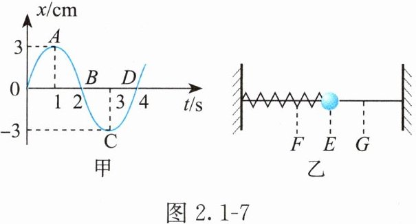 3. 图 2.1 - 7 甲为一弹簧振子的 $ x - t $ 图像,规定向右为正方向,试根据图像分析回答以下问题。