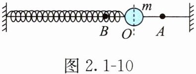 6. 如图 2.1 - 10 所示,有一弹簧振子,小球离开平衡位置 $ O $ 点的最大距离为 $ l $,即 $ OA $、$ OB $ 的长度均为 $ l $。开始时小球被拉到 $ A $ 点,轻轻释放,小球从 $ A $ 点开始向左运动,经过时间 $ t $,第一次到达平衡位置 $ O $ 点,此时小球的速度为 $ v $,则在小球从 $ A $ 点运动到 $ O $ 点的过程中,小球的平均速度大小是多少?