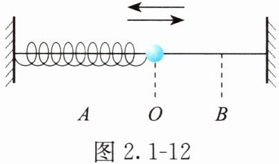 1. 如图 2.1 - 12 所示,弹簧振子的小球在 $ A $、$ B $ 之间做简谐运动,$ O $ 为平衡位置,请判断下列说法是否正确,并说明理由。