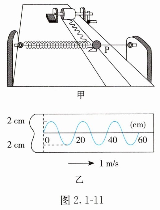 7. 在心电图仪、地震仪等仪器的工作过程中,要进行振动记录,如图 2.1 - 11 甲所示是一种常用的记录方法。在弹簧振子的小球上安装一支记录用笔 $ P $,在下面放一条白纸带,当小球振动时,匀速拉动纸带(纸带速度与小球振动方向垂直),笔就在纸带上画出一条曲线,如图 2.1 - 11 乙所示。若匀速拉动纸带的速度为 $ 1m/s $,作出 $ P $ 的振动图像。