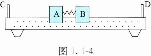 4. 气垫导轨是一种常用的实验仪器。它利用气泵使带孔的导轨与滑块之间形成气垫,使滑块悬浮在导轨上。滑块在导轨上的运动可视为没有摩擦。我们可以用带有竖直挡板C和D的气垫导轨以及滑块A和B来寻求碰撞中的不变量。实验装置如图1.1-4所示(弹簧的长度忽略不计),采用的实验步骤如下: