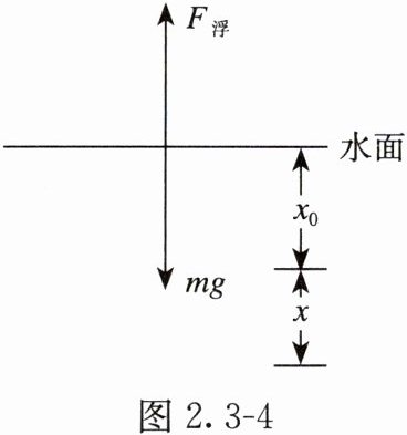 3. 分析回复力:当木块偏离平衡位置向下位移为$ x $时,浸入深度为$ x_0 + x $,浮力$ F_{浮}=\rho g S(x_0 + x) $。回复力$ F=mg - F_{浮} $,代入$ mg=\rho g S x_0 $得: