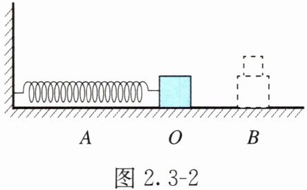 例题 2 如图 2.3 - 2 所示,一物块在光滑水平面上的 $ A $、$ B $ 两点间做简谐运动,平衡位置为 $ O $,已知物块的质量为 $ m _ { 0 } $。若物块运动到 $ B $ 点时将一质量为 $ m $ 的物体放到物块的上面,$ m $ 和 $ m _ { 0 } $ 无相对运动而一起运动,请分析物块(包含上面物体)的最大速度 $ v _ { \mathrm { m } } $、最大动能 $ E _ { \mathrm { km } } $、最大势能 $ E _ { \mathrm { pm } } $、最大振幅 $ A _ { \mathrm { m } } $、最大机械能 $ E _ { \mathrm { m } } $ 如何变化。