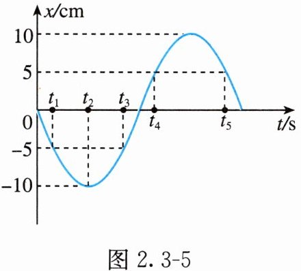 1. 图 2.3 - 5 为一个弹簧振子在水平面做简谐运动的 $ x - t $ 图像,则在动能、势能、速度、加速度、回复力中,问: