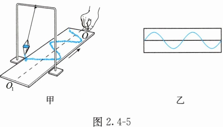 4. 图2.4-5甲是一个沙摆装置,图2.4-5乙是在木板上留下的实验结果。沙摆的运动可看作简谐运动。若手拉木板的速度是0.20 m/s,木板的长度是0.60 m(近似取$\pi^2 = g$),则该沙摆的周期和摆长分别为多少?
