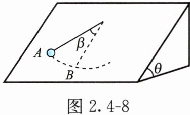 8. 如图2.4-8所示,有一个单摆挂在倾角为$\theta$的光滑斜面上,$B$点为单摆的平衡位置,摆长为$l$,$\beta < 5°$。摆球由$A$点释放,单摆在斜面上摆动的周期为$T$,从最大位移到达平衡位置所需的时间为$t$,重力加速度为$g$,求$T$和$t$的值。