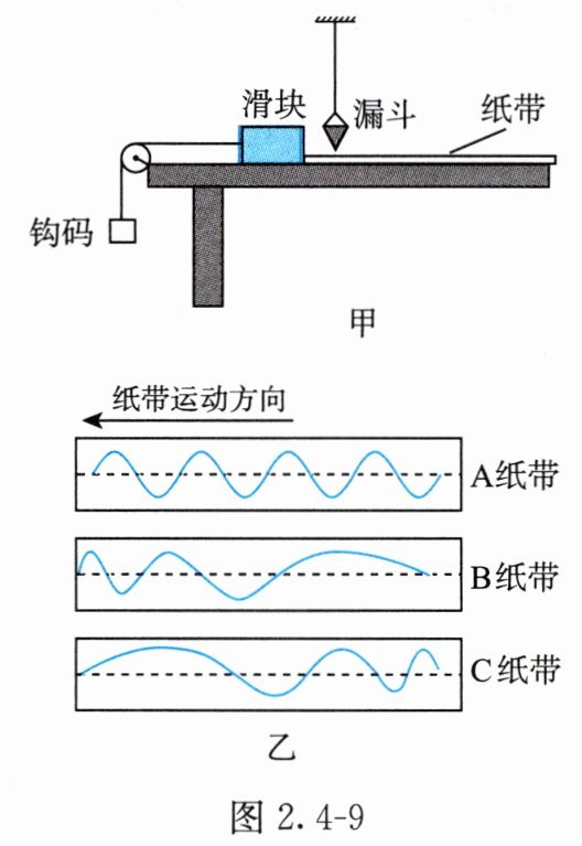 9. 某实验小组用如图2.4-9甲所示的装置研究滑块的运动。实验器材有滑块、钩码、纸带、刻度尺、带滑轮的木板,以及由漏斗和细线组成的单摆等。实验中,滑块在钩码作用下拖动纸带做匀加速直线运动,同时单摆垂直于纸带运动方向摆动,漏斗漏出的有色液体在纸带上留下的痕迹记录了漏斗在不同时刻的位置。