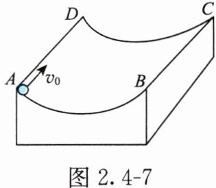 7. 如图2.4-7所示,一个小球自$A$点沿$AD$方向以初速度$v_0$开始运动,已知$A$、$B$两点之间的圆弧长度为0.8 m,其半径$R = 10$ m,$AD = 10$ m,$A$、$B$、$C$、$D$四点在同一水平面内。重力加速度$g$取10 m/s²,欲使小球恰能通过$C$点,其初速度$v_0$应为多少?