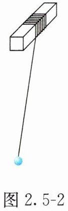 2. 某同学在做“用单摆测量重力加速度”的实验时,为了方便,他把细线的一端绑紧在一方形木条上,然后把细线在方形木条上顺时针缠绕若干圈,细线另一端悬挂一个摆球,让摆球在垂直于方形木条的平面内摆动,如图 2.5 - 2 所示。他把细线与方形木条下端的接触点到摆球球心的距离作为单摆摆长来测量重力加速度,这样测出的重力加速度会比实际值大一些还是小一些?请论述你的结论。