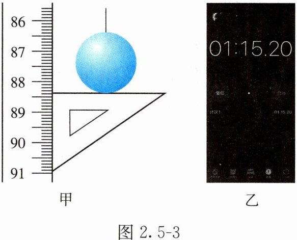 3. 某同学在做“用单摆测量重力加速度”的实验时测得摆球直径为 $ 2.00cm $,让刻度尺的零点对准摆线的悬点,摆线自然下垂,如图 2.5 - 3 甲所示,那么单摆摆长是______ $ cm $。该同学用手机中的秒表测定了 $ 40 $ 次全振动的时间如图 2.5 - 3 乙所示,那么,该手机秒表的读数是______ $ s $,单摆的振动周期是______ $ s $。由此可求得当地的重力加速度大小为______ $ m/s^{2} $。