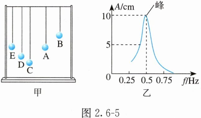6. 某学校实验室中有个实验仪器如图 2.6 - 5 甲所示,五个单摆悬挂于同一根绷紧的水平绳上,五个摆球完全相同。图 2.6 - 5 乙是单摆 $ E $ 做受迫振动时的共振曲线,它表示振幅与驱动力频率的关系。若单摆的摆角不超过 $ 5^{\circ} $,重力加速度 $ g $ 取 $ \pi^2 $ m/s²,请回答下列问题。