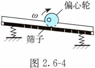3. 把一个筛子用四根弹簧支起来,筛子上装一个电动偏心轮,它每转一周,就给筛子一个驱动力,这就做成了一个共振筛,如图 2.6 - 4 所示。不开电动机让这个筛子自由振动时,完成 20 次全振动用时 15 s。在某电压下,电动偏心轮的转速是 $ 88 $ r/min。已知增大电动偏心轮的电压可以使其转速提高,而增加筛子的总质量可以增大筛子的固有周期。如果想增大共振筛的振幅,该如何调整偏心轮的电压与筛子的总质量?
