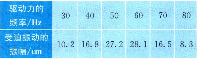 5.乙同学的观点正确。由表格中的数据可知,驱动力的频率为$60\ Hz$时,受迫振动的振幅为$28.1\ cm$,这是表格中记录的振幅中的最大振幅。但该表格属于不完全统计,由表格无法知道当驱动力的频率在$50\sim70\ Hz$时,是否有振幅超过$28.1\ cm$的情况出现。