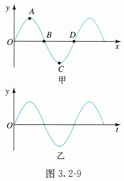 3. (多选)如图 3.2 - 9 所示,图甲为一列简谐波在某时刻的波形图,图乙表示传播该波的介质中某一质点在此后的一段时间内的振动图像,( )。