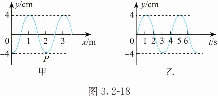 2. (多选)图 3.2 - 18 甲为一列简谐横波在 $ t = 2 \, s $ 时的波形图,图 3.2 - 18 乙为介质中平衡位置在 $ x = 1.5 \, m $ 处的质点的振动图像。 $ P $ 是平衡位置为 $ x = 2 \, m $ 的质点,下列说法正确的是( )。
