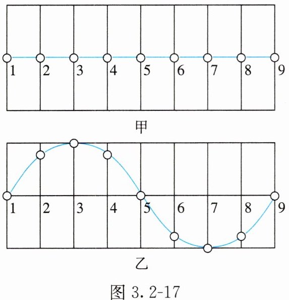 1. (多选)一列简谐横波向右传播,在其传播路径上,每隔 $ l = 0.1 \, m $ 选取一个质点,如图 3.2 - 17 甲所示。 $ t = 0 $ 时刻,波恰好传到质点 $ 1 $,并立即开始向上振动,经过时间 $ t = 0.3 \, s $,所选取的 $ 1 \sim 9 $ 号间的质点第一次出现如图 3.2 - 17 乙所示的波形,则下列判断正确的是( )。