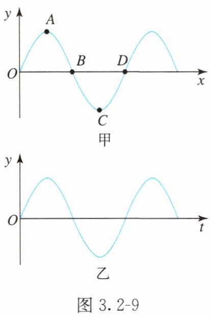 3. (多选)如图 3.2 - 9 所示,图甲为一列简谐波在某时刻的波形图,图乙表示传播该波的介质中某一质点在此后的一段时间内的振动图像,( )。