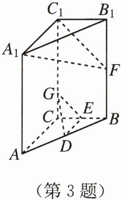 3.如题图,以C为原点,$CA$,$CB$,$CC_1$所在直线分别为$x$轴、$y$轴、$z$轴,建立空间直角坐标系。设$\vec{n_1}=(x_1,y_1,z_1)$是平面DEG的法向量,则$\vec{n_1}\perp \overrightarrow{DE}$,$\vec{n_1}\perp \overrightarrow{EG}$,所以$\begin{cases} \vec{n_1}· \overrightarrow{DE}=-2x_1=0 \\ \vec{n_1}· \overrightarrow{GE}=-y_1+z_1=0 \end{cases}$,解得$\begin{cases} x_1=0 \\ z_1=y_1 \end{cases}$。取$y_1 = 1$,则$z_1 = 1$