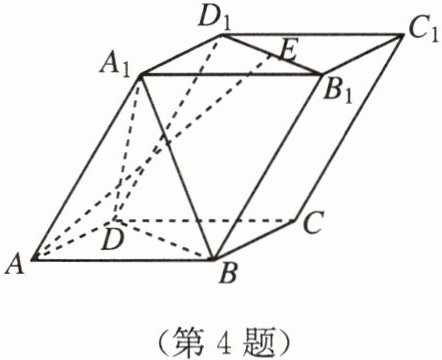 4.因为$\overrightarrow{AE}=\overrightarrow{AD}+\overrightarrow{AA_1}+\frac{1}{2}\overrightarrow{DB_1}=\overrightarrow{AD}+\overrightarrow{AA_1}+\frac{1}{2}(\overrightarrow{AB}-\overrightarrow{AD})=\frac{1}{2}\overrightarrow{AB}+\frac{1}{2}\overrightarrow{AD}+\overrightarrow{AA_1}$,$\overrightarrow{BD}=\overrightarrow{AD}-\overrightarrow{AB}$